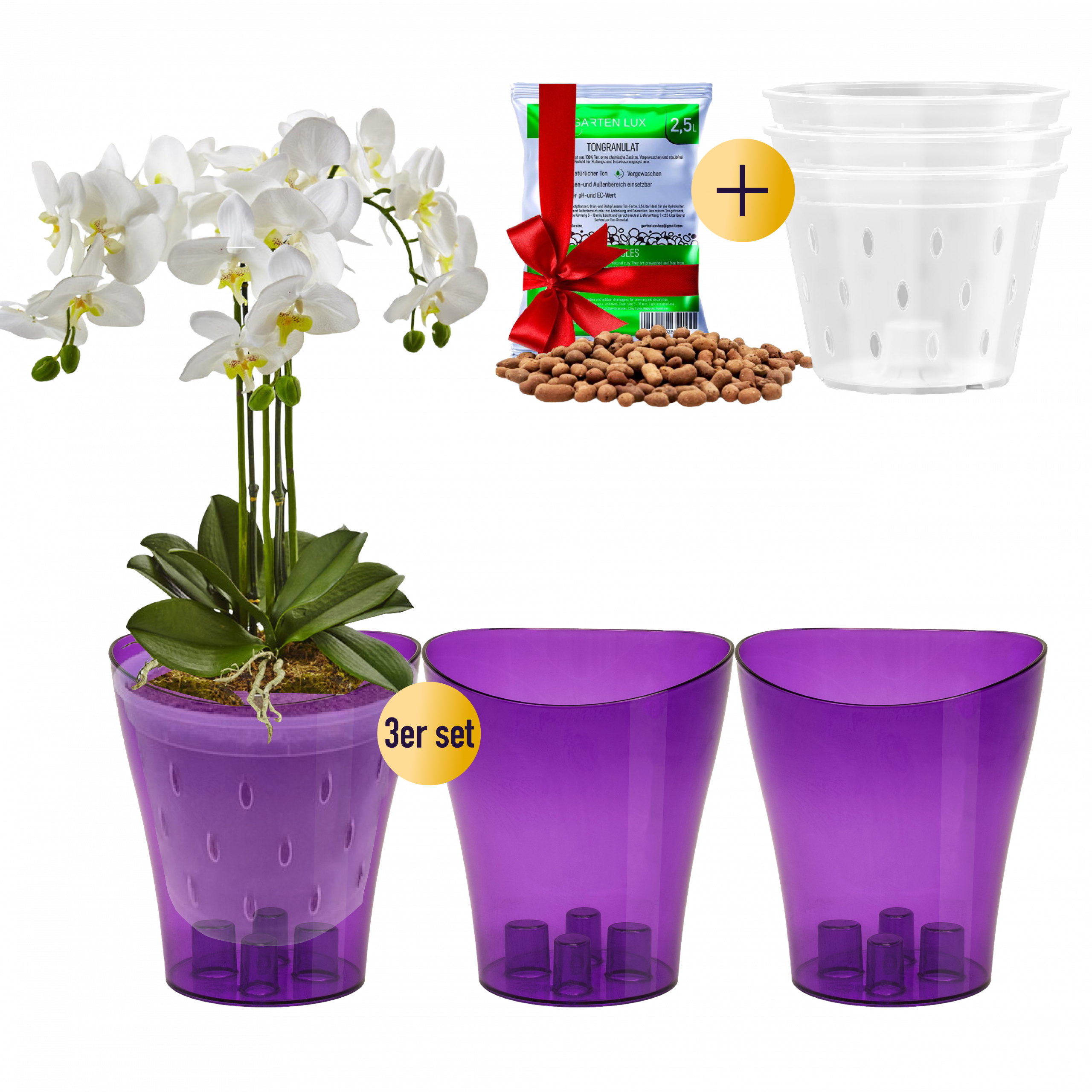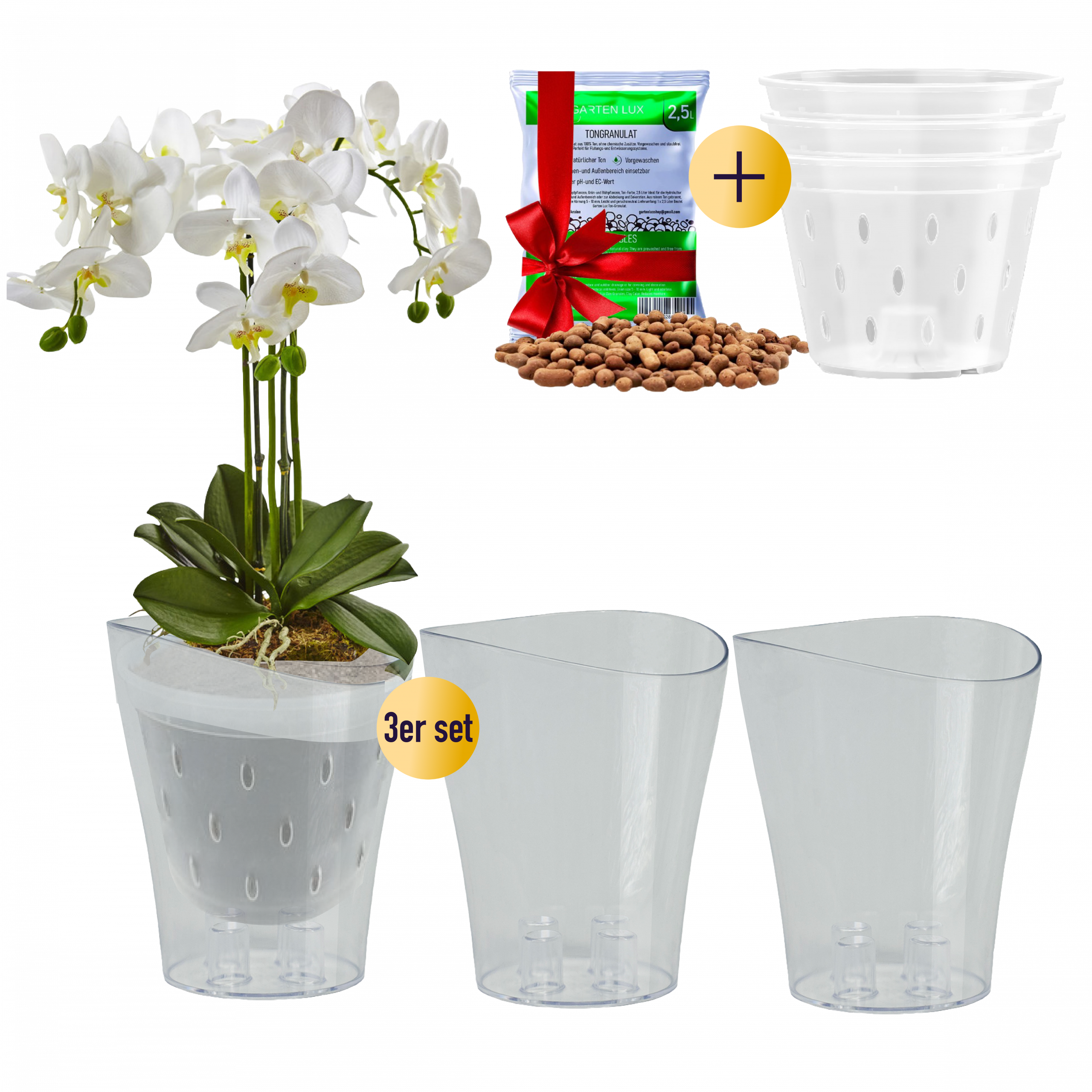 3er-Set Orchideentöpfe aus hochwertigem, halbtransparentem Kunststoff mit integrierten Drainagelöchern und 2,5 L Tongranulat.