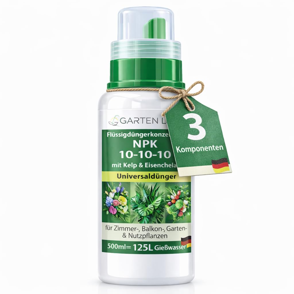 Flüssigdünger Konzentrat NPK 10-10-10 mit Kelp & Eisenchelat – Universaldünger für Zimmer-, Balkon-, Garten- & Nutzpflanzen, 500 ml (125 L Gießwasser)