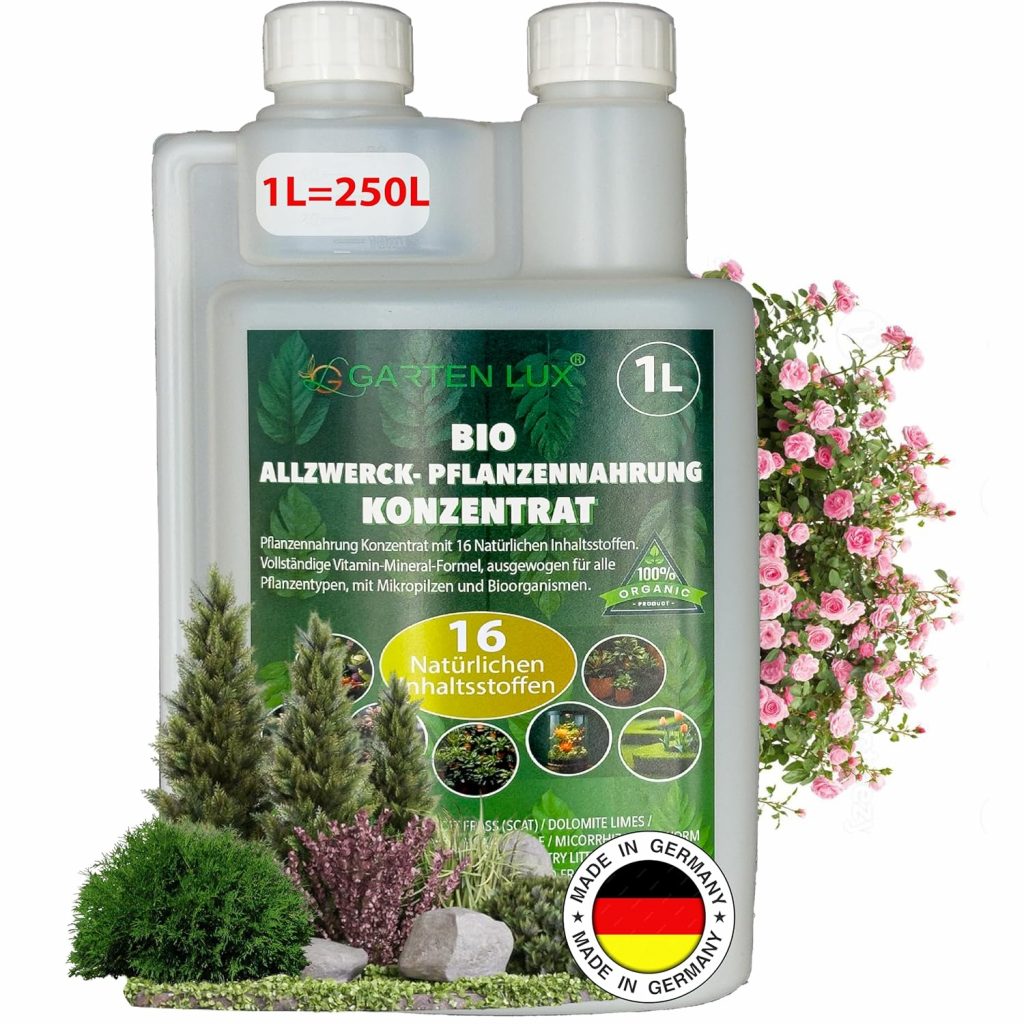 BIO Flüssigdünger Konzentrat für Garten und Zimmerpflanzen, Universaldünger mit 16 natürlichen Inhaltsstoffen, 1L Konzentrat ergibt 250L Gießwasser