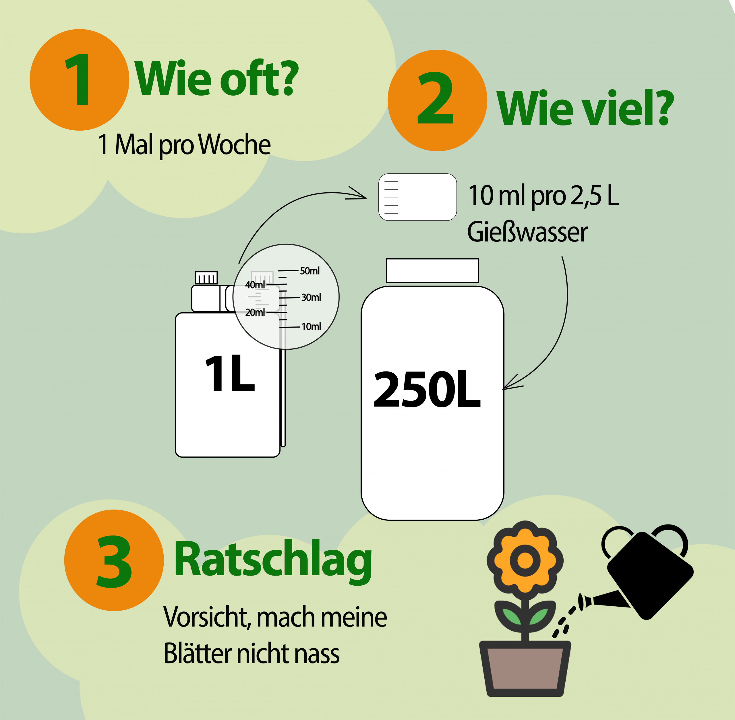 1 Liter Konzentrat ergibt bis zu 250 L Gießwasser. Ideal für die regelmäßige Pflanzenpflege und besonders sparsam in der Anwendung.